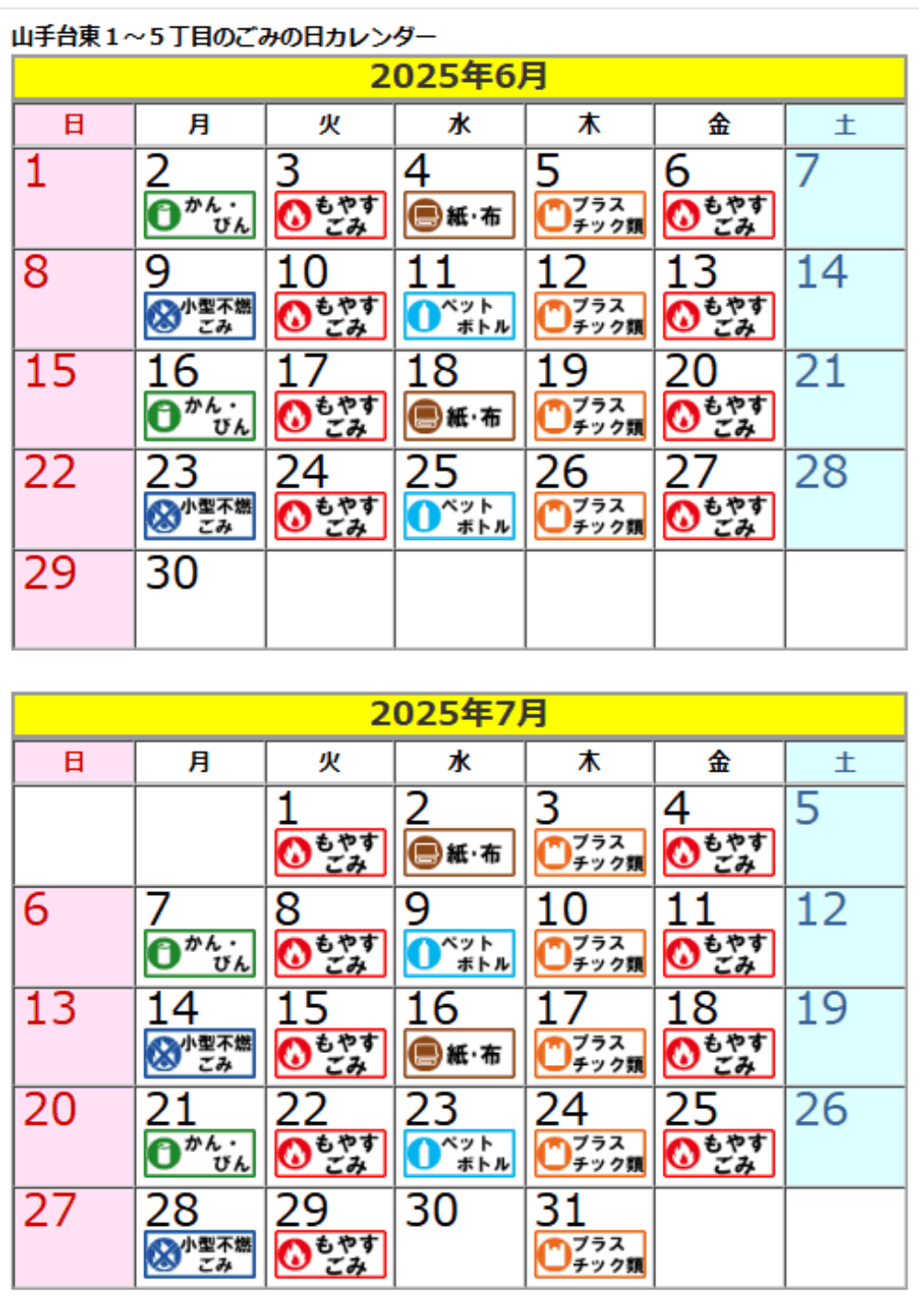 山手台東自治会。スマホでゴミカレンダーが見れます。