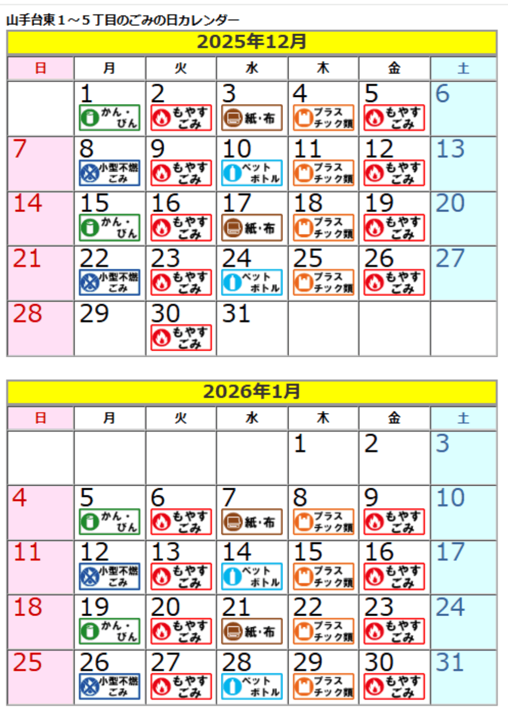 山手台東自治会。スマホでゴミカレンダーが見れます。