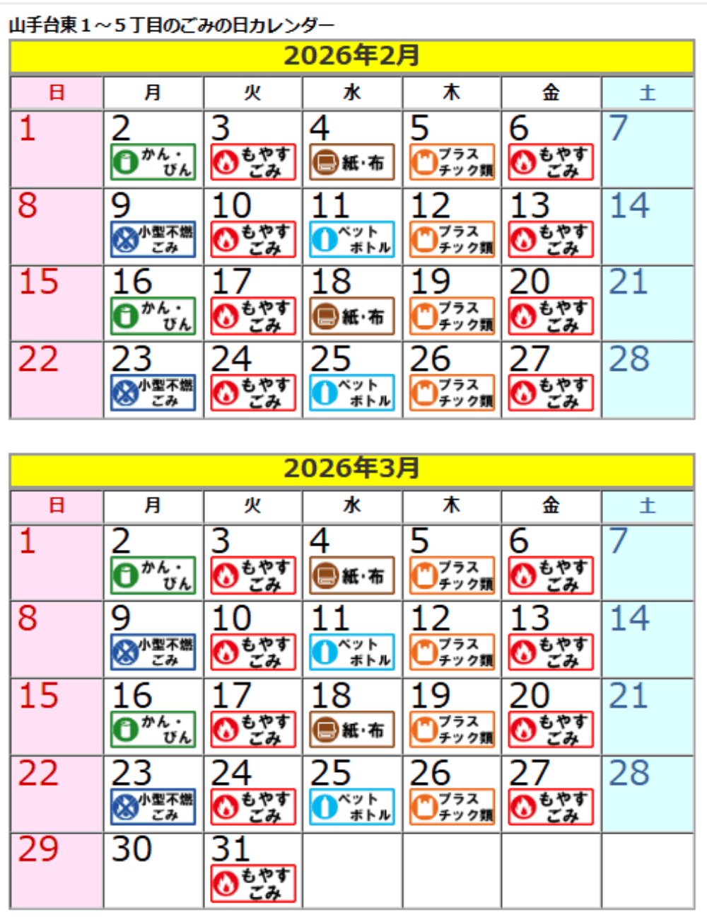 山手台東自治会。スマホでゴミカレンダーが見れます。